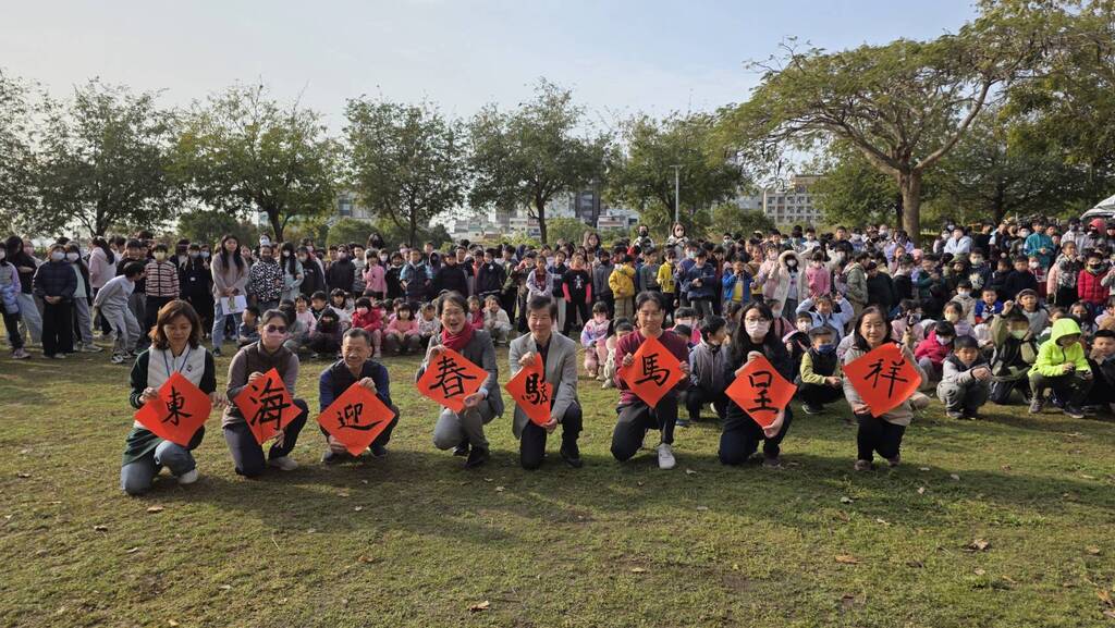 活動一開始,林筆藝校長便邀請兩位重量級嘉賓——台灣知名書法家 陳志聲老師與剪紙國寶 王禎文老師——和校內師長一同在舞台前揮毫,寫下今年的祝福語「東海迎春 駿馬呈祥」。隨著校長一聲清亮又喜氣的「鐺~2026年東海國小新春揮毫活動開始囉!」東海國小夏綠地彷彿像被按下熱鬧開關,孩子們迫不及待地往各個攤位奔去,準備大展身手!而今年,學校也規劃了7大闖關區,讓孩子有既好玩又超有文化味的新春揮毫體驗: