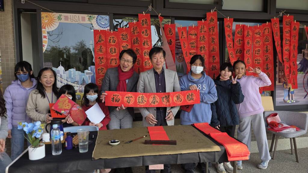 在這一區域,小朋友自己研墨、下筆寫春聯。「春」「福」「吉」之外,竟然還有人用諧音梗創作「Horse 成雙」!老師們都點頭說:「有料!」