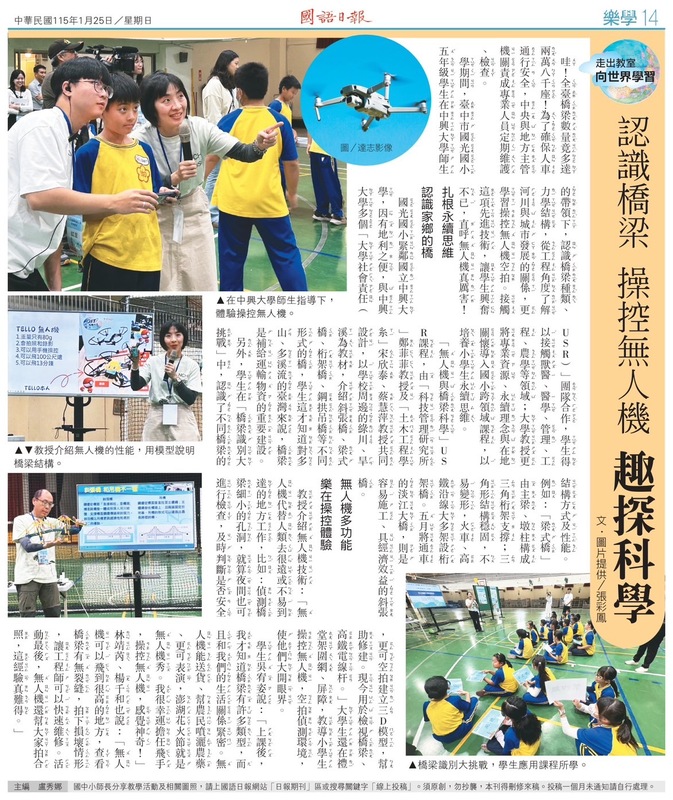 國光國小與中興大學USR計畫合作推動的「河川×橋樑×無人機」科學教育課程,因結合工程概念與科技實作,吸引國語日報到校採訪,並於115年1月25日刊載於《國語日報》樂學版,以〈認識橋樑 操控無人機 趣探科學〉為題,呈現學生豐富而扎實的學習歷程。