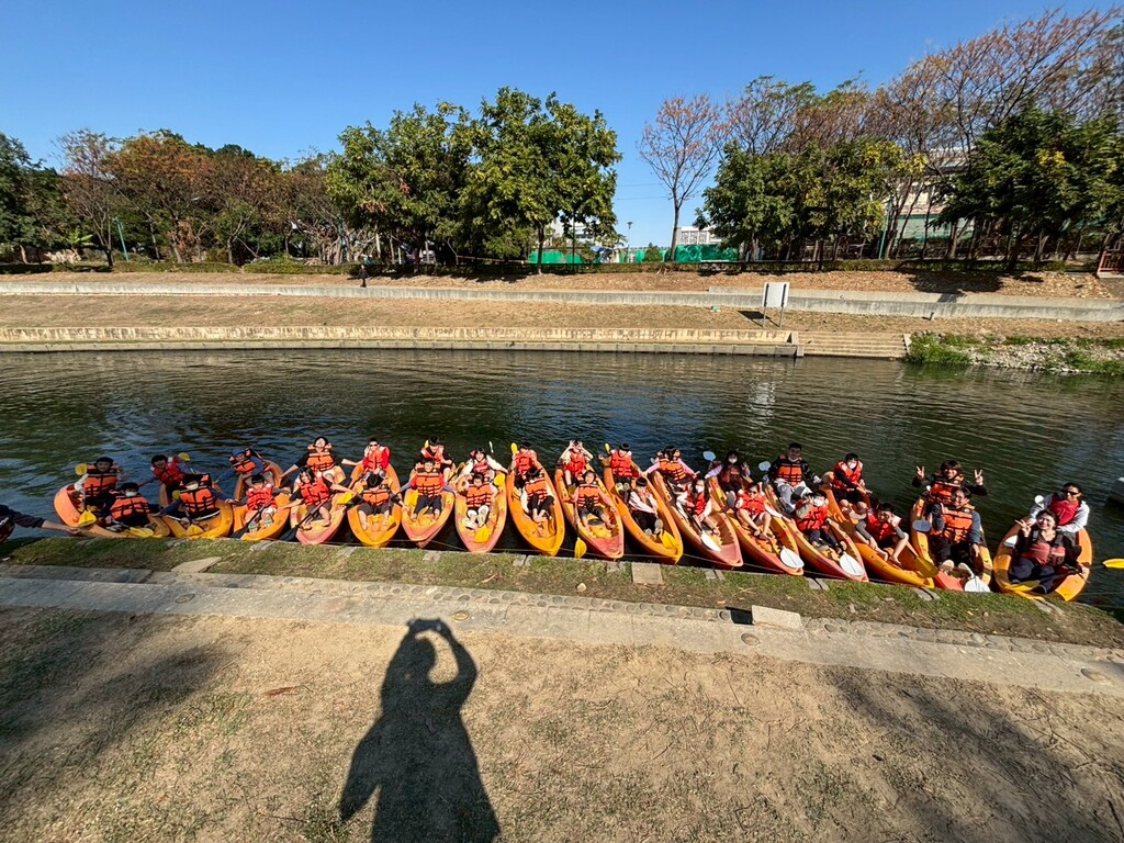 抵達康橋水岸後,在教練的指導下,孩子們先學習水上安全知識,包括如何進行自救、穿戴救生衣、以及正確的拋繩技巧。接著,大家練習划槳,準備踏上真正的水上冒險。對許多孩子來說,這是第一次划輕艇──船身在水面上左右搖晃,有人緊張、有人興奮,也有人一開始就在原地打轉,引得隊友哈哈大笑。更有孩子忍不住把輕艇當成碰碰船,互相撞得樂不可支。過程中,學生邊划邊觀察沿岸景色,驚呼「原來台灣的河岸這麼美!」這一刻,自然環境成了最真實的雙語教室。