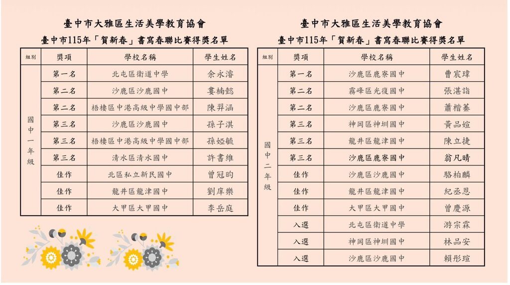 本校學生參加✨大雅區生活美學教育協會✨辦理【115年「賀新春」書寫春聯比賽】,一出手就讓評審老師眼睛一亮👀💥在競爭激烈的比賽中(238人報名、200人到場),本校學生成功拿下👇👇 🥈第二名🥈、🥉第三名🥉、🌟佳作🌟、✨入選✨,只能說~✍️ 字寫得好,年味自然就來了!每一筆都是實力,每一張都是驕傲🥰感謝同學們的用心練習,也感謝指導老師一路相伴,讓傳統書法在校園裡,越寫越有「春」🌸