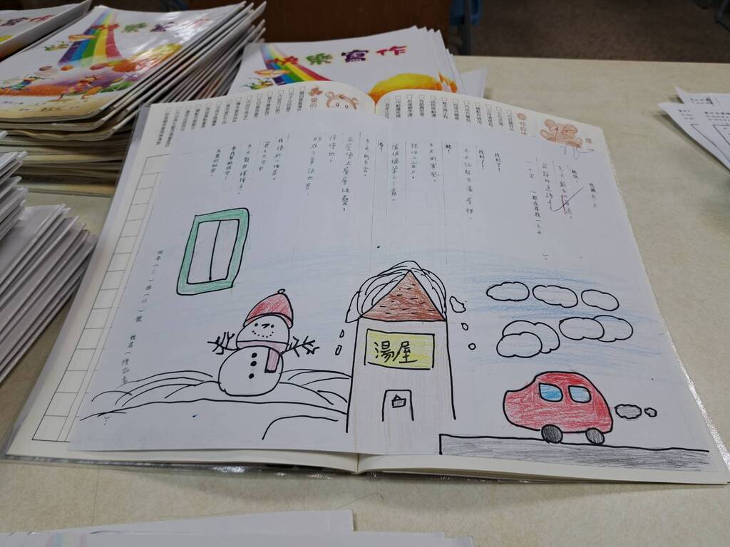 在四年級學生的「快樂寫作」本裡,主任驚喜地發現,孩子們不再只是生硬地堆砌字句。有人用細膩的筆觸描寫冬天的雪景,甚至在文字旁畫上了充滿童趣的雪人與湯屋;那稚嫩卻誠摯的線條,與優美的詩句相映成趣,讓原本單調的作業本變成了充滿想像力的藝術品。