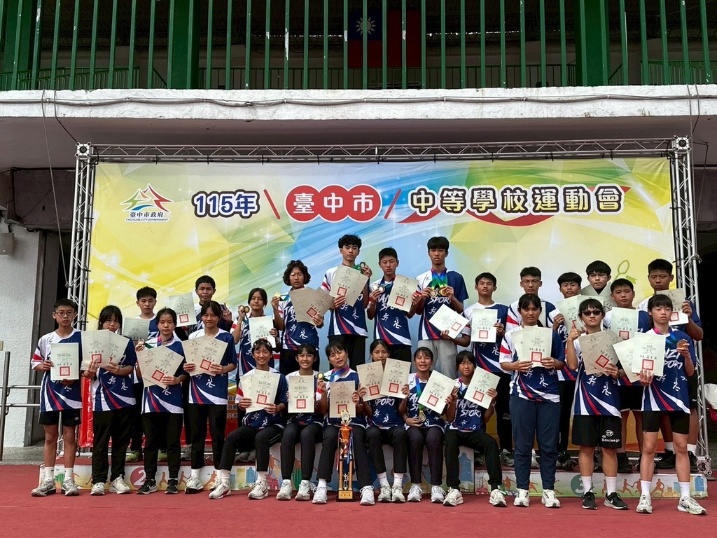本校田徑隊參加「115年臺中市中等學校運動會」,學生於各項田徑競賽中表現亮眼,展現平時訓練成果與堅強毅力,其中國中女子組榮獲總錦標第一名,並多項成績刷新大會紀錄,表現相當優異。茲將競賽成果說明如下: