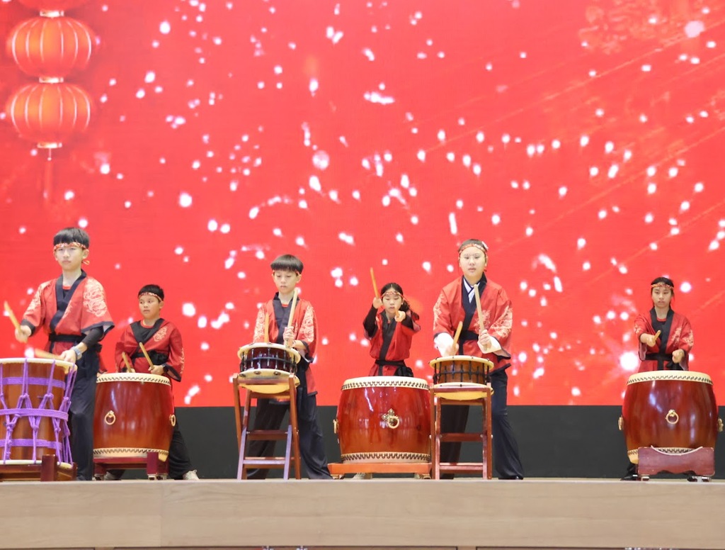 接著由陳婉綺、林文鴻老師指導601班「齊鼓共振賀新春」隆重登場。透過太鼓齊鳴的震撼,再加上舞台背景的襯托,讓原本簡單的賀年表演,營造出光鮮亮麗的舞台效果,增添不少年味。學生更以氣勢磅礡的擊鼓聲,讓節慶氛圍溢滿整個活動中心,將活動帶入高潮。學生透過肢體律動表現,引入辭舊迎新的情懷,讓活動更添創意。震撼的太鼓聲、熱鬧的舞龍舞獅在觀眾席間跑動,以及充滿童趣的歌舞演出「做伙來過年」。校長洪誌敬與家長會長林仁淯祝賀大家新年快樂,送馬年紅包袋滿載而歸,提燈籠為孩子點燈,祝福學業更進步。現場洋溢著歡笑與喜悅,師生們紛紛讚嘆:「太好玩了!」