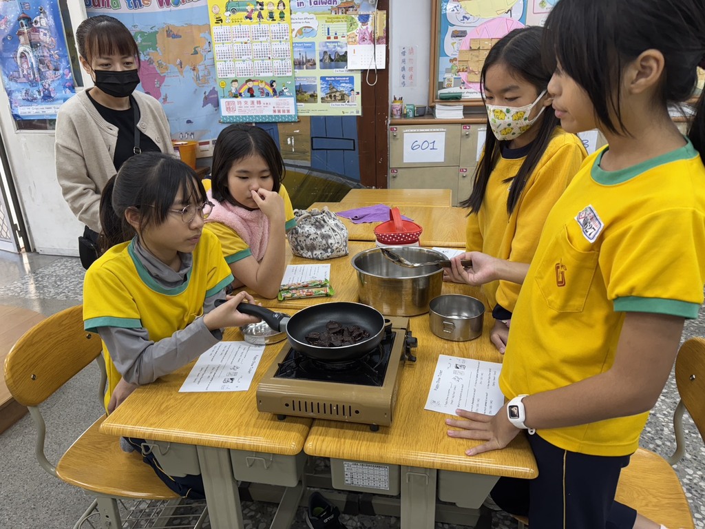 Teacher Josh 這次攜手 Teacher Ruby,為六年級學生帶來一堂充滿香氣與歡笑的特色甜點課程——製作美國經典小點心 Puppy Chow。課程從認識食材開始,學生們在老師的引導下,依序進行備料、加熱巧克力、混合花生醬與奶油,再耐心等待冷卻,每一個步驟都親手完成,將原本只存在於書本與圖片中的甜點,一步一步呈現在眼前。