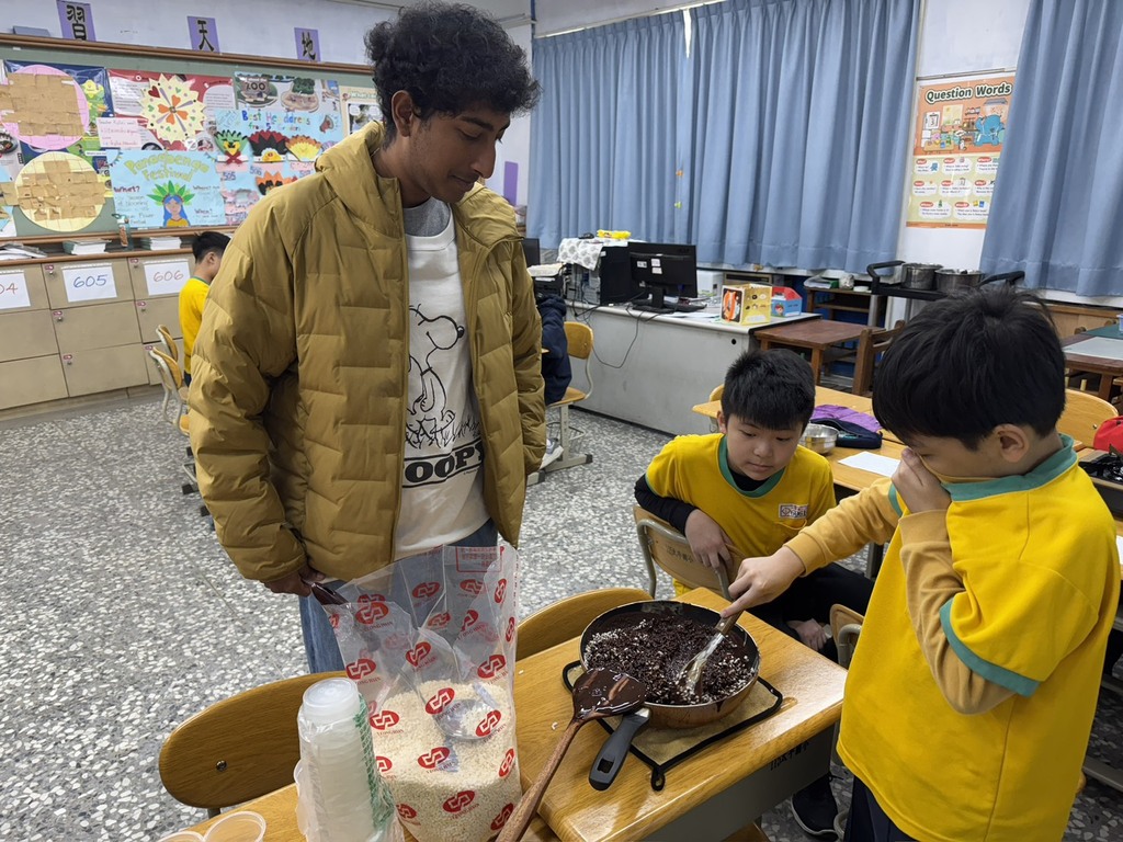 這堂課程同時融入英語學習元素,Teacher Josh 與 Teacher Ruby 透過英文介紹甜點由來與製作方式,讓學生在實作中自然接觸生活英語。老師也向學生說明:「Puppy Chow (also called Muddy Buddies) is a popular American snack and dessert. Even though its name sounds like dog food, it is not for dogs. It is a sweet treat for people. It is made with cereal, chocolate, peanut butter, and powdered sugar.」透過真實情境的語言使用,孩子們在做中學、學中用,提升了學習動機與理解力。