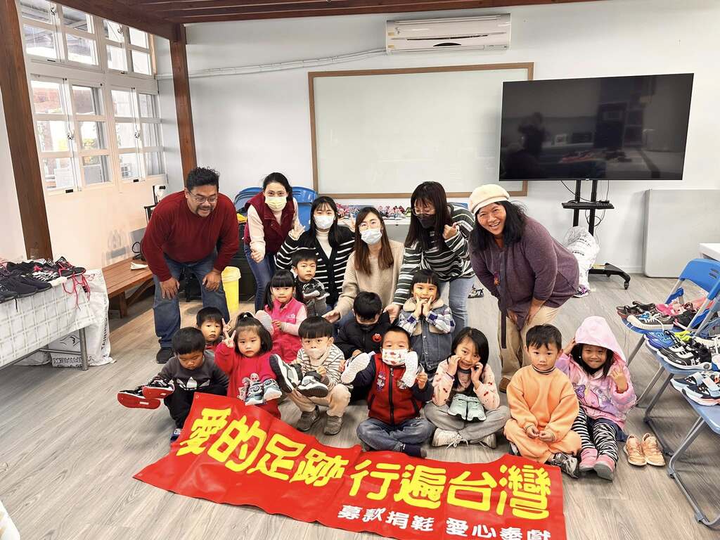 到了東明國小——台中最靠北邊的學校,全部把鞋擺開來,瞬間教室變得像鞋店一樣。