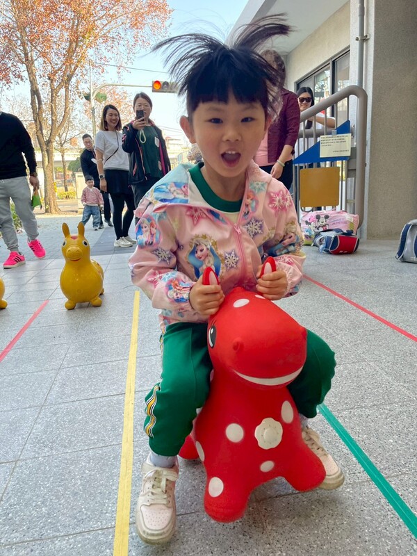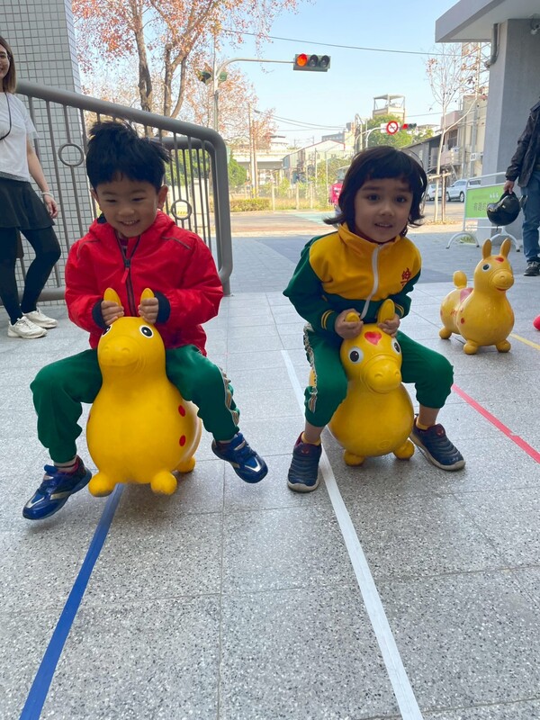 「預備,跳!」隨著歡笑聲響起,樂業附幼的寶貝們紛紛跨上彩色的「跳跳馬」,以充滿活力的方式〝躍〞進校園。這項充滿童心的進場儀式,寓意著「馬躍門庭」,象徵孩子們在新的學期能更有勇氣探索、躍進,健康活潑成長。
