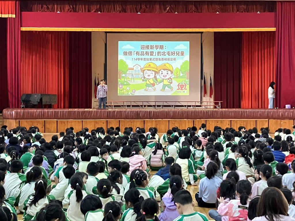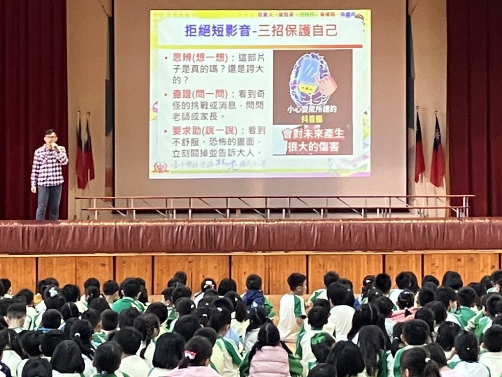 開學乍始,校長主持學校開學典禮暨友善校園宣導。114學年度第二學期宣導主題為「拒絕短影音風險:別被演算法牽著走,思辨、查證、要求助」,學務處張主任強力宣導主題,並叮嚀同學網路正用,融入學期中其他校內課程或活動,以營造正向學習風氣,維護友善校園環境。