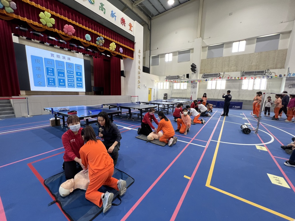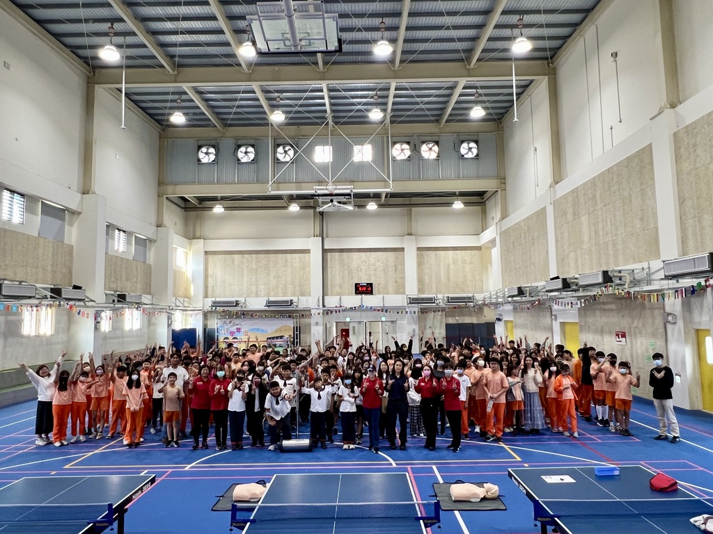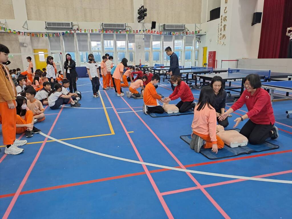 消防隊講師透過活動中心巨型螢幕呈現簡報,除了專業CPR+AED講解,還特別邀請五位消防隊「鳳凰志工」將7個班學生分成五組輪流進行「安妮」教具的實作訓練,讓本校學生不僅掌握的急救口訣,更在志工的協助下一對一的動作校正與示範,在學生心中紮下守護生命的珍貴種子。