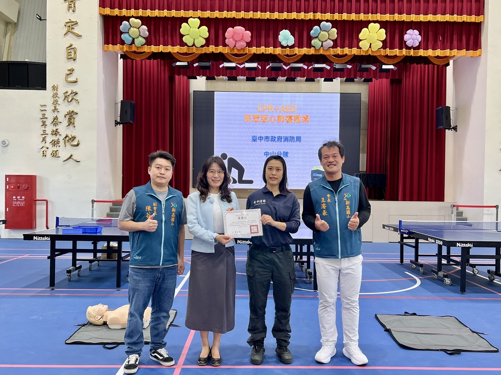今日感謝臺中市政府消防局第三大隊中山消防分隊帶領本校六年級學生進行心肺復甦術(CPR)暨自動體外心臟去顫器(AED)宣導,黃杏媚校長、王濬豪會長、陳谷正副會長及李珮珊秘書(黃佳恬議員辦公室)一起到現場鼓勵學生學好這項「能救人」的「帶著走能力」。