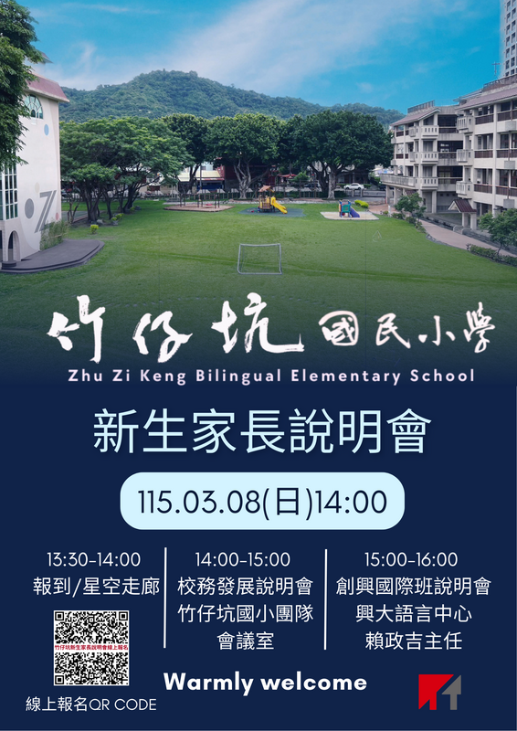 竹仔坑國小將於115年3月8日(星期日)下午2:00辦理新生家長說明會,誠摯邀請今年8月即將入學的小一新生家長,以及關心沉浸式英語教學的鄰里朋友,一同走進校園,了解孩子未來六年的學習藍圖。