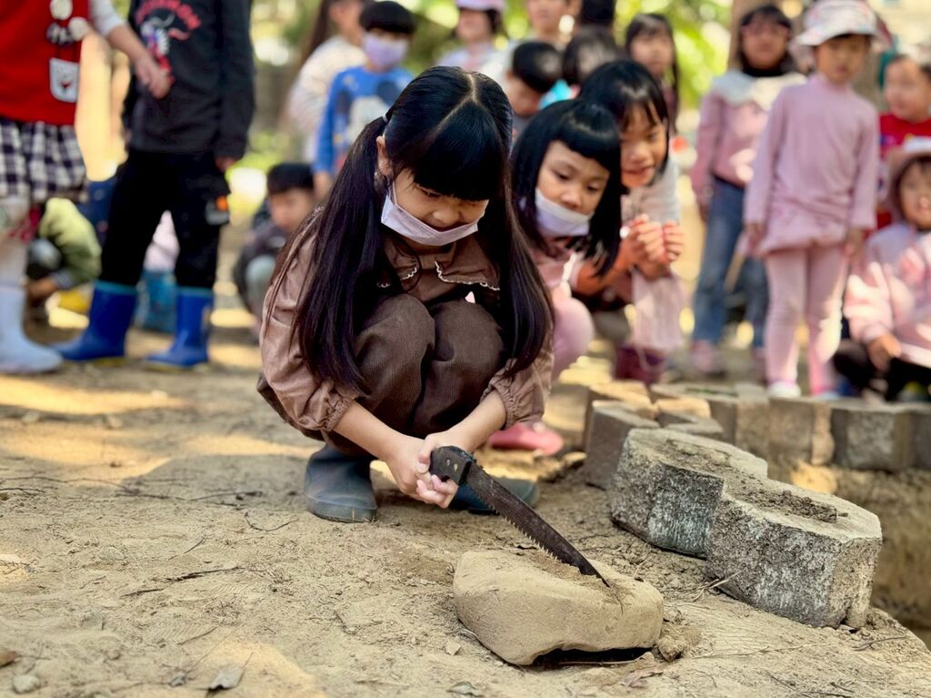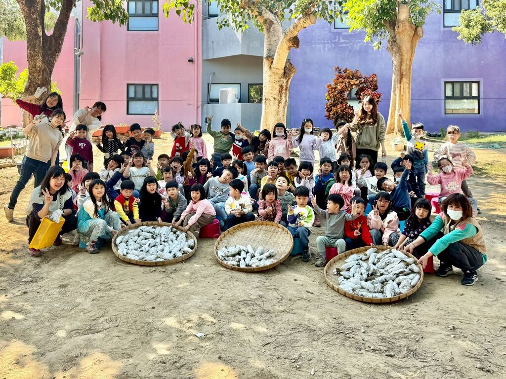 山羌班李佩珊老師說:「山羌班在中班時跟著園長爸爸利用地瓜莖養地瓜,也在這照顧的日子反覆的幫地瓜澆水、整理地瓜莖、拔草、施肥,到地瓜長大了收成了。這過程孩子們身體力行,照顧起來不馬虎!控窯的活動前的準備,山羌班利用不同工具挖土製作著土塊,土很重,孩子們臉上掛滿笑容。在以前小班有控窯的經驗,因此這回孩子們更投入在土窯的搭建、起火、濃煙,觀察著土窯和火、風的關係。地瓜出窯,熱呼呼、香噴噴的地瓜讓孩子們迫不及待想大快朵頤!回到教室,大家一起品嚐地瓜,說著「地瓜好甜!」很開心一路和孩子們一起照顧地瓜、烤地瓜,讓地瓜直接從產地到餐桌呢!」園長陳議濃表示:「這次的烘窯洞比起歷年都還要來得大,也吸取了之前的經驗來增加窯體的穩固性。孩子們齊心合力把窯蓋好,依序放入柴火與地瓜。當地瓜出土的那一刻,孩子們都非常興奮與開心,終於能品嚐自己努力的成果。整個地瓜課程活動歷經了半年多的時間,孩子們一路細心照顧,到最後吃到香甜的地瓜,相信這會成為他們珍貴又甜蜜的回憶。」