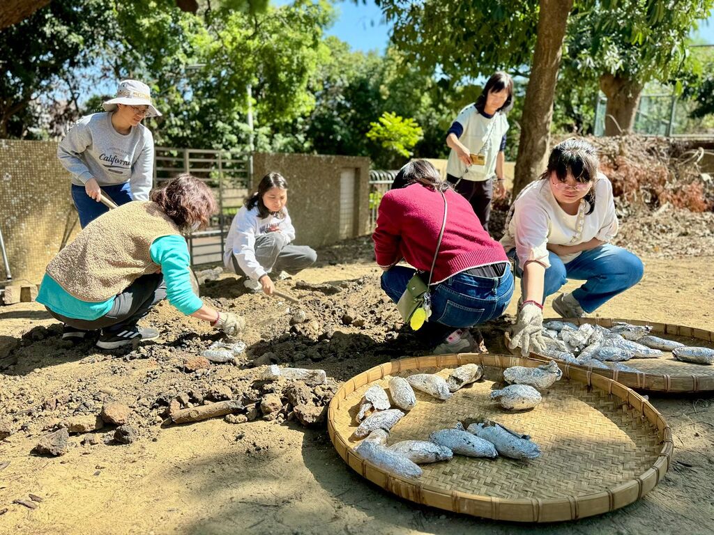 經過二十分鐘的燒窯後,整個窯體的土塊都變得通紅,充滿熱氣。這時孩子們輪流拿起包好的地瓜,朝窯洞裡丟進去。為了讓地瓜受熱均勻,放置時也分成三層,一層地瓜、一層火炭交錯排列,最後再蓋上厚厚的土壤,避免熱氣散失。完成後,經過中午的午睡時間,就是地瓜出爐的時刻。孩子們看著一顆顆地瓜從土裡被挖出來,陣陣地瓜香伴隨著炭烤的味道飄散開來。輕輕打開鋁箔紙,撕去地瓜皮,金黃色的地瓜肉立刻露出來。孩子們迫不及待咬上一口,都直呼特別美味、特別好吃。這些香甜的地瓜也分送給全園師生,讓大家一起品嚐這份努力的成果。