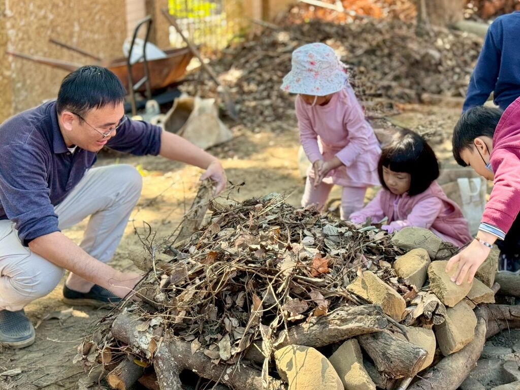 這次的烘窯活動不僅非常順利,也是整個地瓜種植課程的高峰體驗。山羊班幼生王仰希說:「我們幫忙蓋地瓜的家,這次蓋得很堅固。」山羌班幼生黃郁宸說:「我們做的土塊剛剛好可以堵住縫隙,這樣熱就不會跑掉。」梅花鹿班幼生張少宇說:「地瓜甜甜很好吃,烤地瓜很有趣。」山羊班林憶婷老師說:「天氣溫暖,大家齊坐在大樹下一起來控窯!第一次搭土窯,對大家來說都是新鮮又特別的經驗,園長爸比傳授孩子們堆窯秘訣,粗樹枝打底、接著放著一層一層的土塊,熱情的小幫手們到地瓜田撿拾可用的土塊,忙碌的走了好幾趟、不怕手弄髒,大家的合作逐漸讓土窯成形。待土窯燒熱、放入地瓜,孩子們午覺睡起來、地瓜也悶熟了!原本想讓孩子體驗挖土找地瓜,但土壤仍燙手,就由老師們代表出馬,突然有種重溫小時候控窯的樂趣;熱騰騰的烤地瓜出爐,原本還睡眼惺忪的孩子都醒了,熱呼呼金黃鬆軟的地瓜,孩子們一口接一口,並將這份甜蜜分享給全校的小朋友。」梅花鹿班關新蓓老師說:「這次的焢窯運用校園中可得的素材,如樹枝、樹葉與土塊,一起合作搭建地瓜窯。過程中孩子們合作分工,有人搬土、有人撿樹枝、有人協助堆疊結構,展現出良好的團隊精神。將昨日清洗好的地瓜放入窯中烘烤時,孩子們更是充滿期待,希望能將香甜的地瓜與全校分享。相較於先前的搭窯經驗,這次幼兒明顯更加駕輕就熟,不僅搭建速度更快,結構也更穩固,從中看見孩子在經驗累積中的成長與進步。在一片香甜的地瓜香味中大家一起享受收成的美好!」