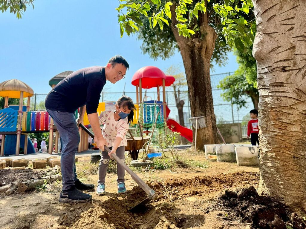蘇怡嘉老師說:「後院的玉蘭花樹曾經陪伴我們一年的時間,那一年我們在這棵樹上發現了無數隻的綠斑蝶毛毛蟲、不知名的小蜘蛛、小黑螞蟻,還有綠繡眼媽媽築巢生蛋,短短的兩週透過手機錄影,看到鳥寶寶從肉球到長滿羽毛的模樣…,很感謝這棵樹出現在我們小班的歲月。聽園長爸爸說這陣子玉蘭花樹好像有一點點生病了,葉子上長了白點、樹幹有點乾裂了,如果它不在了,許多小生物也可能將不會再來了,加上它所處的位子水份嚴重流失,這棵玉蘭花樹需要我們幫忙拯救。今天園長帶著我們幫忙處理了水份流失的問題,我們先在樹的外圍幫忙挖了一個小小的水池,園長爸爸有教我們使用鋤頭挖土,雖然鋤頭比我們還高而且很重,但是我們大家都很努力的幫忙挖水池,還撒了肥料給它,因為我們想要玉蘭花樹可以變得更健康,我們還對它說了甜甜的話,希望它能長出翠綠的葉子,開出漂亮又香的玉蘭花,吸引更多小生物來我們的後院。」園長陳議濃表示:「這次玉蘭花集水圈的開鑿,白兔班的孩子們展現了高度的工作默契與執行能力。不僅在分工時能互相協助,也能依照每個指令把工作的細節做到最好。無論是辛苦的開鑿工作,或是整理周邊的落葉,都能看到孩子們的能力與行動力。也希望這棵玉蘭花在白兔班的照顧之下,能更加健康茁壯,繼續擔任學校環境教育的重要角色。」