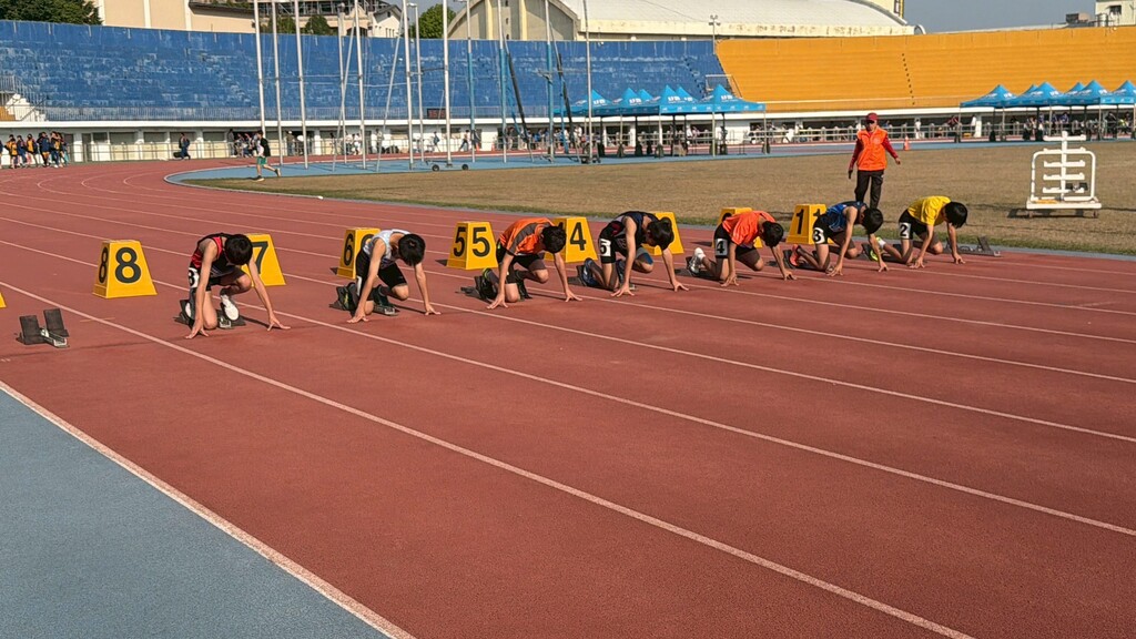 為了準備這一刻,孩子們在育佳老師的帶領下,經歷了漫長且紮實的訓練。每日的校園早自習,都能看見他們專注地進行標準馬克操,精煉起跑與擺臂的技術指導。為了提升體能強度,他們在學校有限場地的直線跑道、圓形操場上揮灑汗水,挑戰自我的極限。在賽前,老師更是不厭其煩地帶領大家進行全身伸展,確保每一寸肌肉都準備就緒,預防受傷,也移地到太平區運動場,讓孩子適應接近比賽的場地。