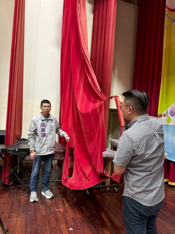 會勘現場,周永鴻議員親自蹲下查看禮堂地板。原本應平整的鋪面因長年使用,多處出現裂縫與凹凸不平,對於在此上體育課的孩子來說,每一場球賽、每一次奔跑都潛藏著絆倒受傷的風險。當現場拉起厚重的紅色布幕時,老舊的五金支架發出的聲響,以及昏暗的燈光,都顯現出這座禮堂早已跟不上現代教學的需求。