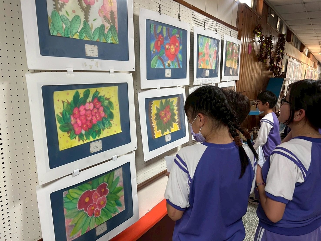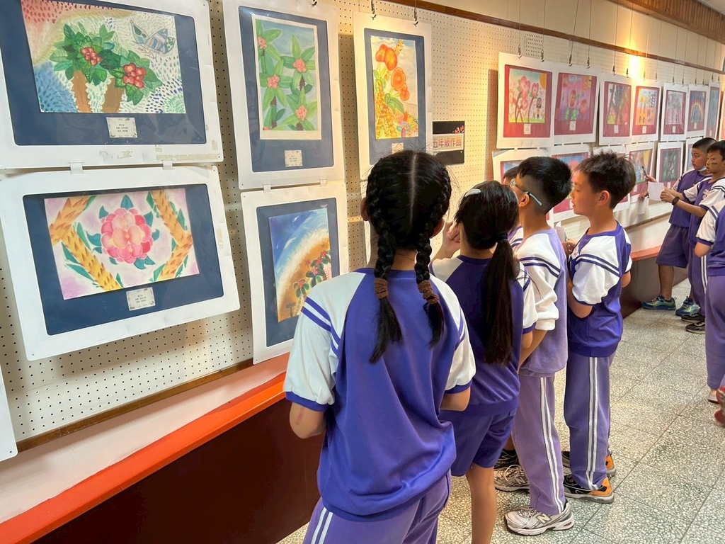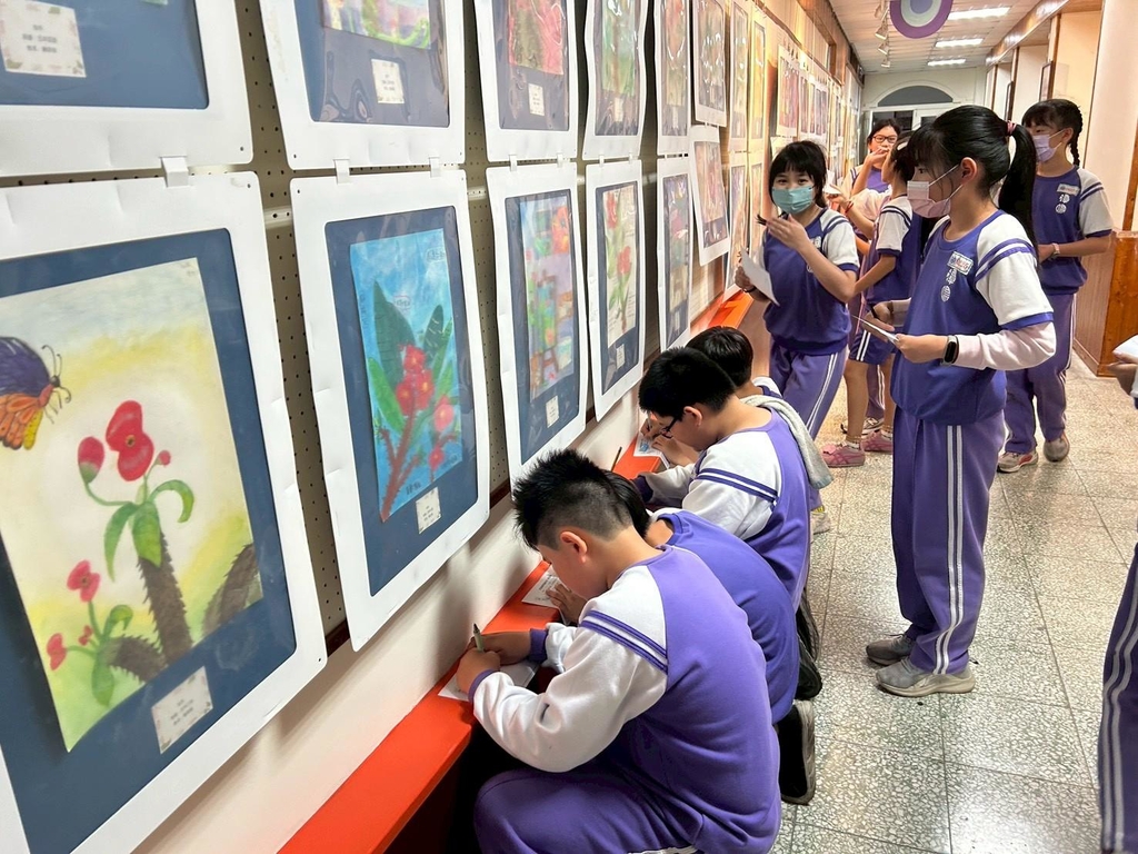 走進學府藝廊,兩側牆面掛滿了學生精心繪製的植物畫作。從鮮紅欲滴的麒麟花到翠綠挺拔的校園樹種,孩子們利用色鉛筆、水彩等多元媒材,捕捉校園植物的各種姿態。有的作品細膩描繪葉脈的紋理,有的則融入了蝴蝶與昆蟲,展現出完整的生態意象。每一幅畫作不僅是藝術呈現,更反映了學生平時對校園環境的敏銳觀察。