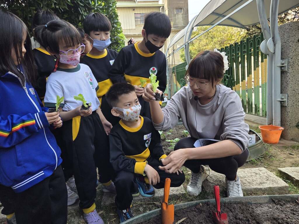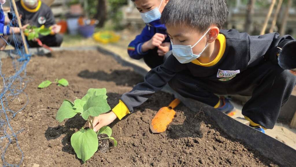 對一年級學童而言,定植宛如一場神聖的生命儀式。在老師的引導下,孩子們化身「小小建築師」,謹慎地執行搬家三部曲:首先在鬆軟的泥土裡挖出象徵新家地基的坑洞;接著輕輕捏壓育苗盆,溫柔地將菜苗「脫殼」,深怕傷及脆弱的根部;最後將菜苗穩穩放入坑中,用泥土妥善覆蓋並輕輕拍實,彷彿為菜寶寶蓋上一床溫暖的厚被子。看著菜苗整齊排列在菜園裡,學童們充滿成就感地驚呼:「它們住豪宅了,一定能長得很大!」