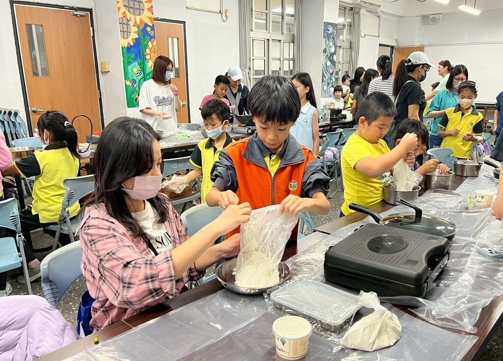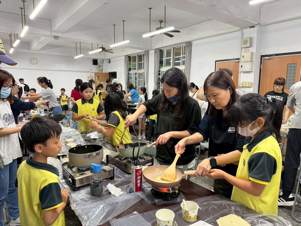 最令人期待的環節莫過於下鍋煎餅。大廚專注地操控卡式爐,煎出一片片金黃酥脆的蔥油餅,助手也在旁協助,準備餐具。當香氣四溢的蔥油餅出爐,親子們迫不及待地品嚐勞動成果,臉上洋溢著滿足的笑容。這次活動不僅讓孩子們體驗了手作的樂趣,更增進了親子感情,讓家庭幸福的味道在校園飄香。