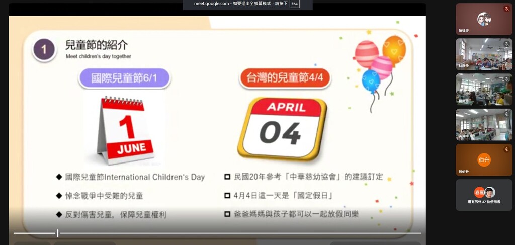雖然是透過 Google Meet 進行線上教學,但學生的熱情絲毫未減。鈞傑老師巧妙運用閩南語詞彙,如「出門迓迓(tshì-tshì)」(出門走走)、「父母節」等生活化用語,讓孩子們在聽故事的同時,自然而然學會閩南語的表達方式。畫面中可以看到各班級的孩子聚精會神,對國外不同的兒童節習俗驚呼連連。