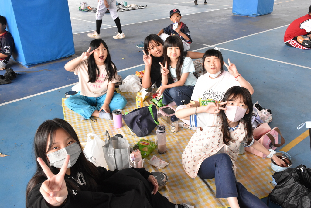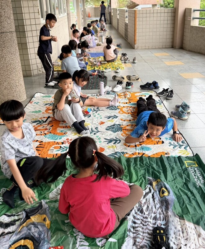 雖然天空飄著細雨,但大仁國小的走廊與光電球場卻顯得格外溫馨。原本要在無患子樹下展開的野餐墊,如今齊整地鋪設在通風寬敞的走廊上。學生們圍坐在一起,分享著彼此帶來的點心,空氣中瀰漫著地瓜球與雞蛋糕的甜香。這不只是一場躲雨的聚會,更是一堂學會隨遇而安的品格課。