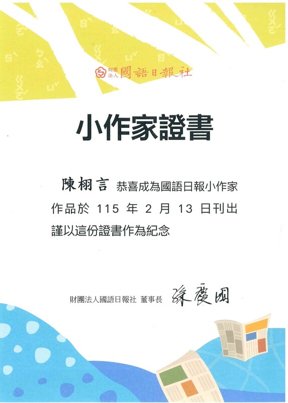 忠孝國小再傳語文佳績!學生陳栩言以作品〈棋盤上的修行〉榮獲《國語日報》小作家殊榮,成功刊登,展現深厚的觀察力與沉穩的書寫功力。