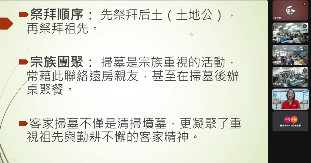 英華老師在教學PPT中提到,不同於河洛人多集中在清明節當日祭祖,客家人通常在元宵節過後(正月十六)至清明前便會開始掃墓。透過各類習俗的解析,例如北部客家族群與屏東六堆地區在擇日上的細微差異,讓孩子們瞭解到即便是同一族群,也會因地域產生不同的生活智慧。學生們在視訊畫面上反應熱烈,積極透過螢幕與老師互動,課室氣氛熱絡。