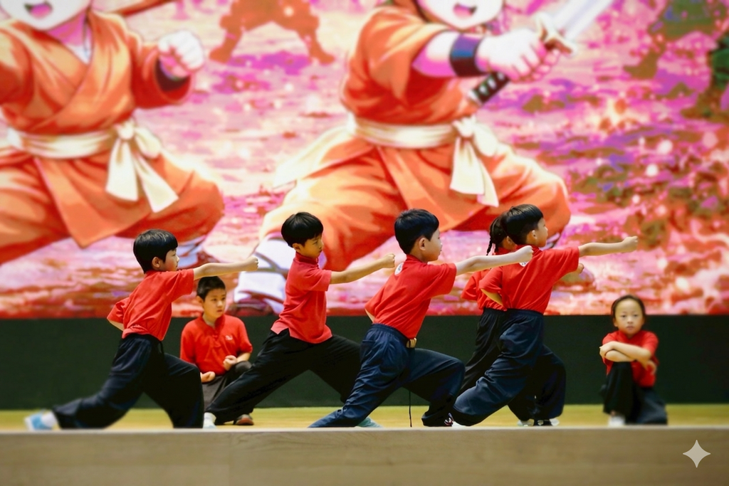 這場演出的核心在於「以詩入武」,讓孩子在揮拳踢腿間感悟文化之美。表演由初級班率先登場,在《少林英雄》節奏下,孩子們以紮實的「少林連環拳」為表演熱力開場。