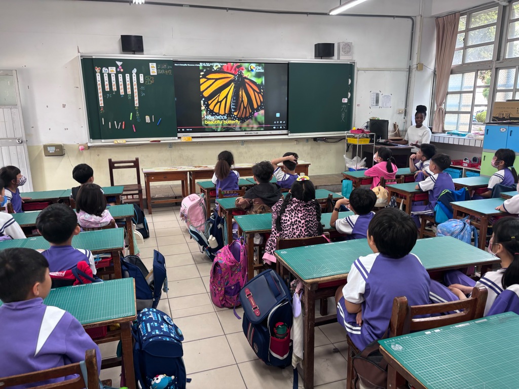 活動一開始,Sophie 老師利用教室的大型螢幕投影出色彩斑斕的繪本畫面,立刻吸引了全班同學的目光。老師用豐富的肢體語言與生動的語調,將毛毛蟲從「卵」到「破繭成蝶」的過程演繹得活靈活現。