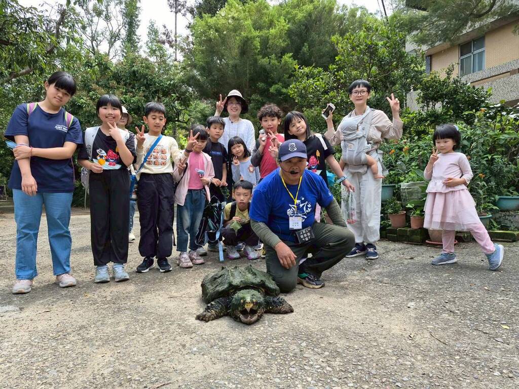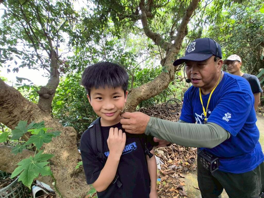 活動中,孩子們近距離認識低空盤旋的大冠鷲、在溪砂中「倒退嚕」的蟻獅,以及各類青蛙、貓頭鷹巢箱與五色鳥的樹洞小窩,還觀察到紅色天牛、印尼挺蜥、巨大蜈蚣與靈活的蛇類等生物,甚至見識到飛奔迅速的鱷龜,現場驚呼連連、氣氛熱絡。除了動物觀察,江老師也介紹八角櫻桃、神秘果及各式香草與防蚊植物,讓親子從生活中認識自然。