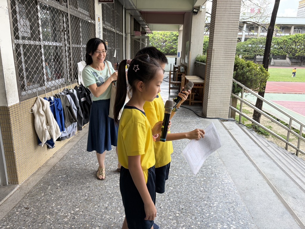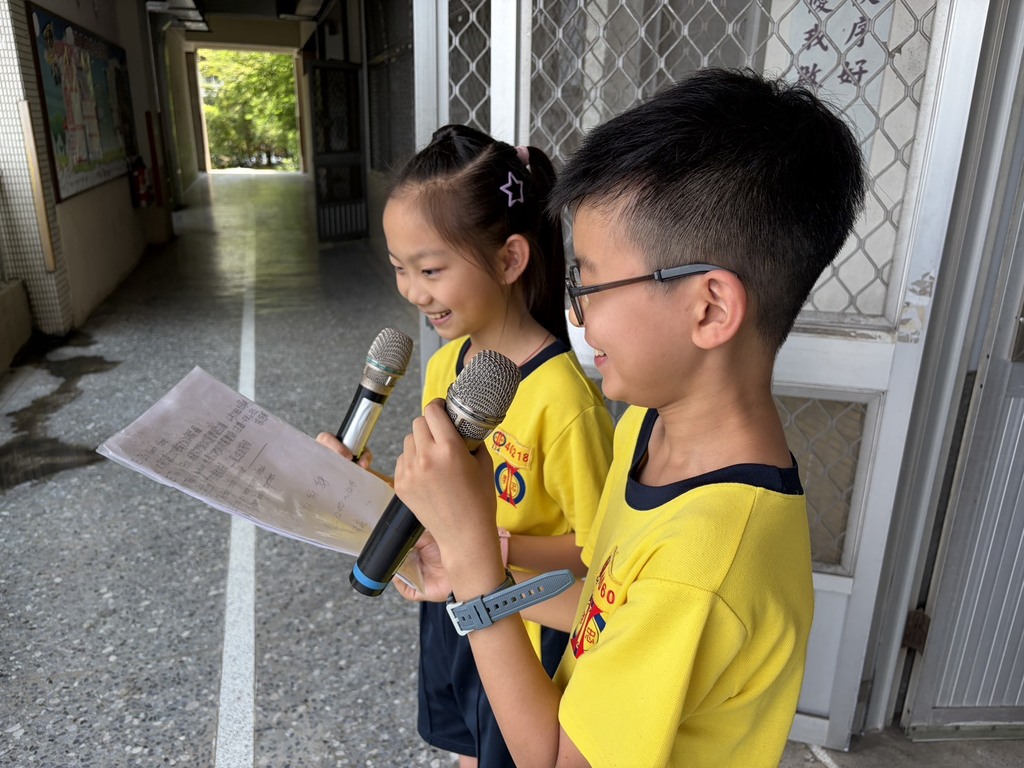 日前播音活動由 402 班杜宥妡與 406 班張恆煒兩位同學攜手擔綱。兩位小小主持人展現大將之風,手持麥克風以流利的英語進行引言,自信的模樣與標準的發音,成為校園廊道中最美的風景。