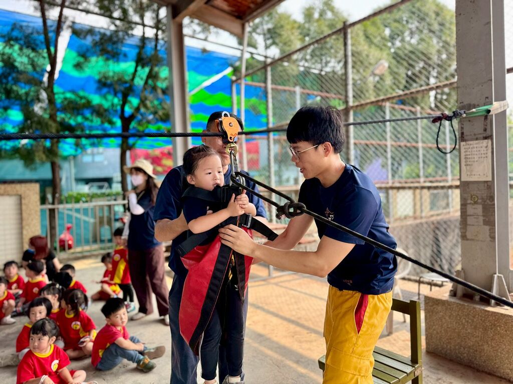 另有「安全溜繩體驗站」,讓孩子們學習從高處安全下降的技巧。在消防哥哥的保護與指導下,孩子們穿戴好裝備,緩緩沿著繩索向下滑降。有些孩子雖然一開始略顯緊張,但在鼓勵與完善的安全保護下,都能勇敢完成挑戰,臉上也露出滿滿的興奮與成就感。另一關「婦宣隊宣導」則由親切的婦宣阿姨們進行示範,透過簡單易懂的方式,教導孩子們防火與滅火的基本觀念,例如正確的逃生姿勢,以及遇到火災時應如何應變與自救。透過實際演練與互動問答,孩子們在輕鬆的氛圍中學會重要的安全知識。