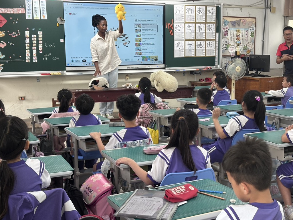 在互動環節中,Sophie 老師高舉著黃色小鴨布偶,引導孩子們大聲喊出「Duck!」,現場氣氛熱烈。孩子們目不轉睛地盯著黑板上的單字與大螢幕上的動畫,在歡笑聲中自然而然地學會了 Cat、Duck、Pig、Cow 等動物單字。