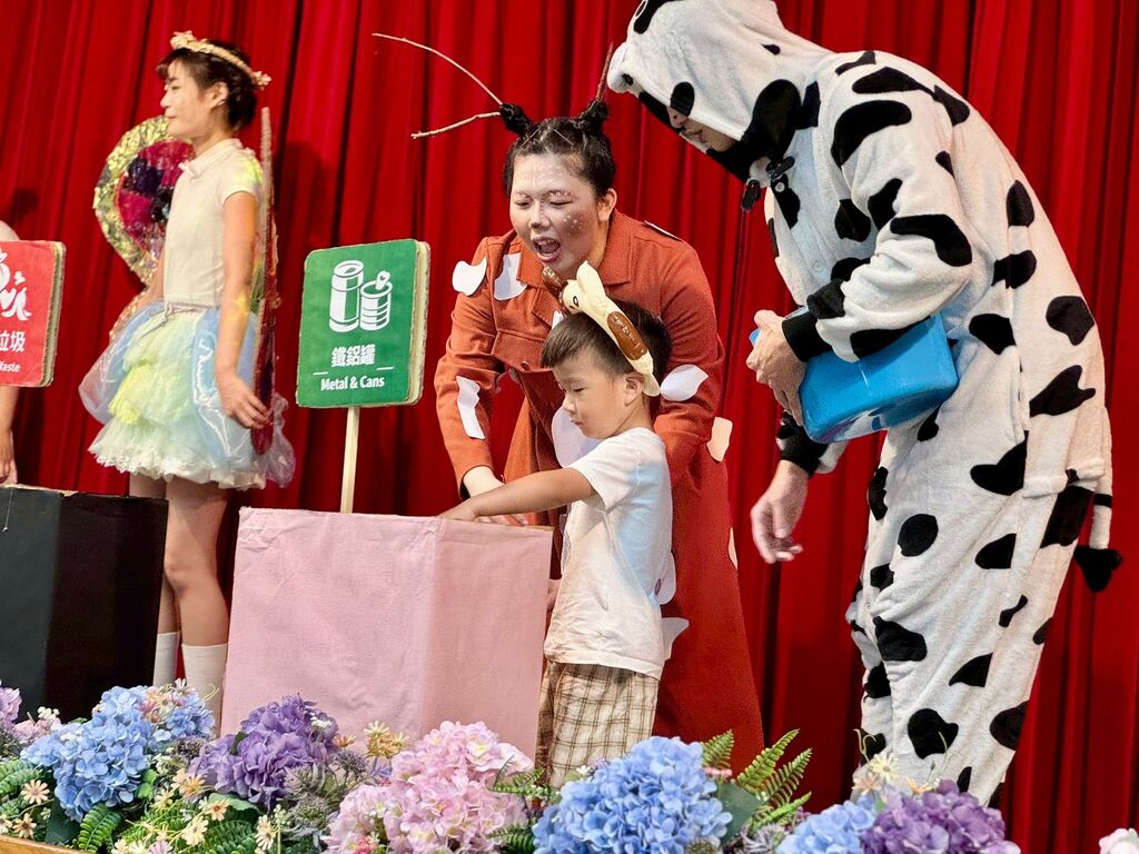 故事進行到高潮時,演員們更邀請現場的孩子們一起上台參與。孩子們踴躍舉手,開心地走上舞台,在哥哥姐姐的引導下學習如何進行垃圾分類。透過實際操作,孩子們認識了不同種類的垃圾應該如何分類,也更加理解環境保護的重要性。接著,全場一同唱起愛護環境的歌曲,朗朗上口的旋律與簡單易懂的歌詞,讓孩子們在歡唱中加深印象,將環保觀念自然融入心中。