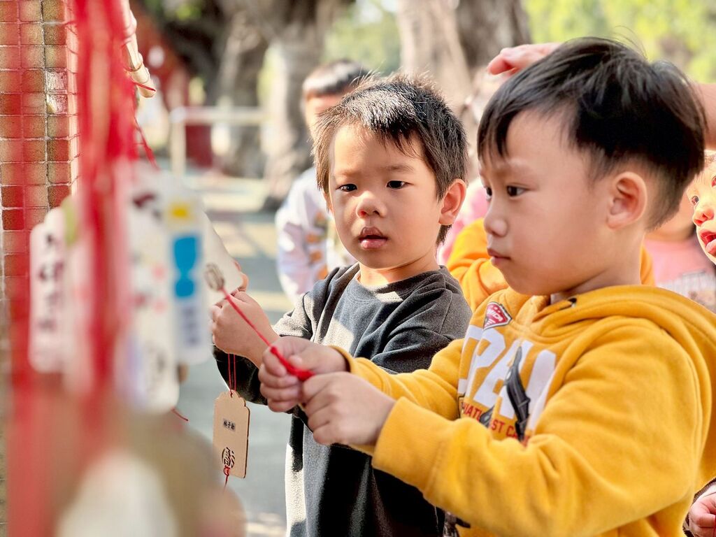 2026-01-28 南屯區 南屯幼兒園 陳議濃 報導點閱數:250 次教學活動隨著第二十四個節氣「大寒」過去,農曆新年也悄悄走近。提到春節,腦海中總會浮現熱鬧的新春慶典與喜氣洋洋的佈置,而這份熱鬧與喜悅,也一點一滴醞釀著大家對新年的期待與希望。南屯幼兒園為了讓孩子們心中的願望能夠自在、開心地表達出來,特別規劃了「祈福許願卡」活動,邀請孩子們透過書寫、彩繪,甚至是自由塗鴉的方式,勇敢說出心中的期盼。 本次的許願卡設計,仿照日式新年祈願卡的形式,以溫潤的木質版面為底,搭配喜氣洋洋的紅色繩帶,作為孩子們創作的舞台。孩子們可以獨立發揮想像力,用色筆描繪心願;也能與家人一同討論、合作完成,或運用黏貼素材,創作出自己最喜歡的圖像。不論採用哪一種方式,每一張許願卡都是獨一無二的存在,也承載著孩子最純真的心願。 當所有許願卡準備完成後,最令人期待的吊掛時刻也隨之到來。吊掛地點設在學校正門口兩側的圍牆,上方共設置了十二根竹桿。孩子們開心地拿著自己的許願卡,在老師的帶領下來到門口,在協助下小心翼翼地將卡片綁上竹桿,確認牢固後,還不忘多看幾眼完成後的模樣。看著一張張隨風搖曳的許願卡,大家也開心地合影留念,並在心中默默期盼,願望有一天能夠實現。 活動完成後,全園十四班的許願卡整齊排列,畫面既繽紛又壯觀,讓人看了心情愉悅,也更添對新年的期待。白鼻心班幼生高立宇說:「我的許願卡會跟著風吹來吹去,敲到會發出喀喀的聲音,很好聽。」梅花鹿班王丞佑則分享:「我畫得很漂亮,也希望自己的願望可以實現,大家新年快樂!」水獺班林奕瑄老師說:「新的一年到來,寶貝們和爸爸媽媽一起在祈願卡畫下、寫下新年願望,大家來到學校後不僅開心的互相分享,在將祈願卡掛上後更是興奮的說要帶爸爸媽媽來看呢!相信新的一年大家一定都能萬事如意、心想事成呦!」 松鼠班徐素雯老師說:「松鼠許願卡由幼兒與家長共同創作,承載著滿滿的期許與祝福。今天帶著幼兒一起將願望掛起,看著一張張許願卡隨風擺動,幼兒臉上洋溢著期待與喜悅的笑容,老師的心也被這份純真與溫暖填滿,倍感幸福。」 教務組長蕭文嘉說:「本學期最後一項全園性活動—祈福許願卡正式展開,邀請大家將對 2026 年的願望 一一寫下來。透過書寫與分享,讓彼此知道在新的一年裡,不只是期許成長,更能為自己設定目標,勇敢朝夢想前進。我們將一張張滿載祝福與希望的許願卡高高掛起,象徵將心中的期待交付天地,也提醒自己用行動一步步實踐。孩子們純真的願望,映照出對未來的美好想像;而大人的心願,則蘊含對生活、家庭與工作的溫柔期盼。 在祈福的過程中,我們不僅為彼此祝願,也共同展望新的一年。期盼 2026 年,每一位孩子都能平安長大、快樂學習;每一位大人都能心有所向、行有所成,在愛與陪伴中,攜手走過 幸福美滿的一年。」園長陳議濃說:「新年許願卡的設計概念,除了讓孩子以藝術創作的方式表達心願外,也將這些作品轉化為校門口充滿年味的風景,打造出獨特又溫馨的正門許願牆。希望在新的一年裡,大家都能越來越好,心中的願望也能一一實現。」