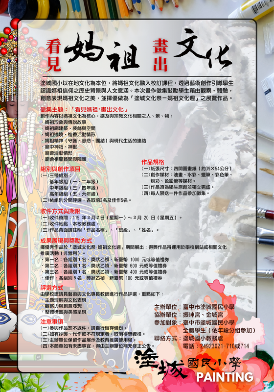 2026-01-20 大里區 塗城國小 教務處 報導點閱數:159 次校園新聞【塗城報導】為深耕在地文化並落實校訂課程,塗城國小攜手在地信仰中心振坤宮與金城宮,盛大舉辦「看見媽祖・畫出文化」畫作徵集活動。校方期盼透過藝術創作,引導學子深入觀察並體驗媽祖信仰的歷史底蘊與人文之美。 本次徵集活動主題豐富,鼓勵學生以「媽祖文化」為核心發揮創意。無論是媽祖慈悲莊嚴的形象、傳說故事,或是廟宇建築的雕樑畫棟、熱鬧非凡的遶境進香、藝閣陣頭等場景,皆可作為創作素材。學生可運用水彩、蠟筆等多元媒材,在四開畫紙上盡情揮灑,將傳統信仰與現代生活連結,展現獨特的童趣視角。 獲獎的優秀作品將成為「塗城文化祭-媽祖文化週」的展覽亮點,甚至登上學校官網進行文化推廣。塗城國小教務處誠摯邀請全校同學拿起畫筆,用色彩記錄家鄉的信仰溫度,讓大家看見不一樣的媽祖文化。