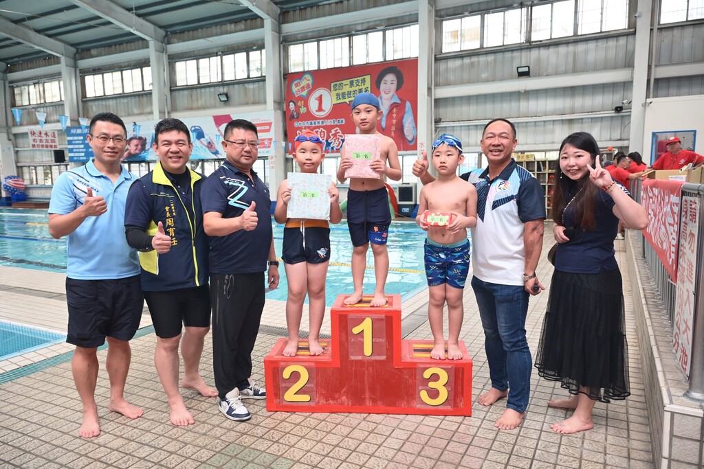 2025-11-11 大里區 塗城國小 學務處 報導點閱數:113 次校園新聞【塗城報導】塗城國小106週年校慶系列活動熱鬧登場!「會長盃游泳比賽」日前在歡呼聲中展開,泳池畔擠滿了加油人潮,家長與師生齊聚,一同為小選手們打氣,現場笑聲、歡呼聲此起彼落。 賽事從浮板踢水、捷式、蛙式到高難度的蝶式,孩子們皆奮力展現平日的練習成果。而最受歡迎的「親子接力」與「水中尋寶」更是將氣氛帶到最高點。 在家長會周育任會長、歷任會長及黃富揚校長的加碼支持下,今年尋寶獎金創新高。當家長會委員們豪灑硬幣時,孩子們眼神發亮、全力尋寶,泳池瞬間化為歡笑的海洋。校方感謝家長會與來來游泳池的熱情協助,為孩子們創造了滿載勇氣與笑容的校慶回憶。