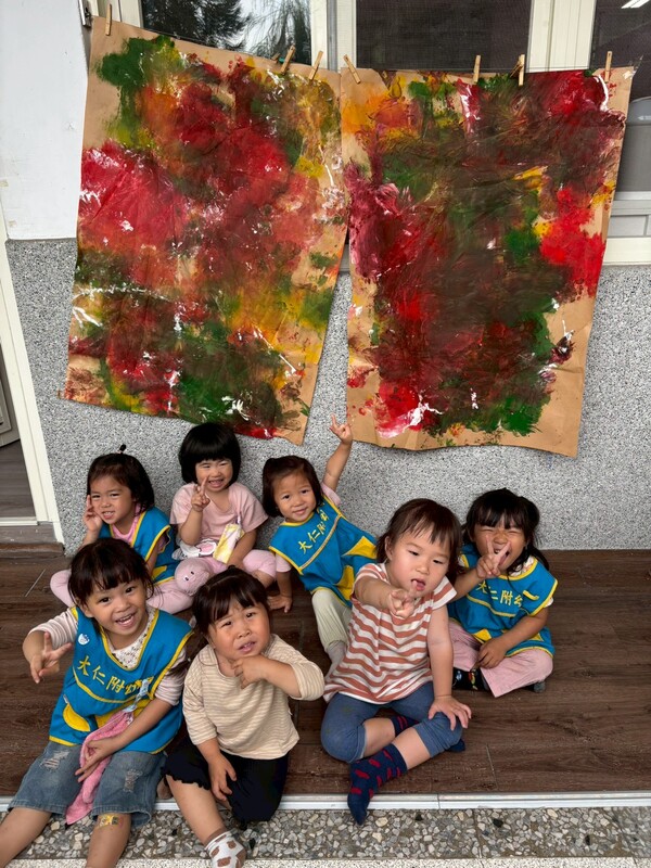 2026-04-10 西屯區 大仁國小 幼兒園 報導點閱數:205 次校園新聞孩子們將紅、黃、綠顏料擠在牛皮紙上,展開一場充滿色彩的探索活動。活動開始前,老師先引導孩子們觀察顏料的顏色,並鼓勵孩子猜一猜:「不同顏色碰在一起會發生什麼變化呢?」引起孩子的好奇心與探索的動機。 接著老師協助鋪上養生膠帶,讓孩子嘗試用雙手擠一擠、拍一拍,或用雙腳踩一踩、跳一跳,甚至用身體在上面滾一滾,體驗不同的觸覺感受。 完成後,老師帶著孩子們撕下養生膠帶,揭開創作的成果,孩子們露出驚喜的表情,有孩子開心地分享:「你看!有好多顏色,好漂亮唷!」也有孩子興奮地分享:「好像怪獸喔!」展現出豐富的想像力。 接著,我們再加入些許的白色顏料,孩子們都目不轉睛地看著,迫不及待地想再踏上牛皮紙試試看。有的孩子興奮地在上面跳一跳,也有的孩子小心翼翼地踩上去,並分享說:「滑滑的。」、「溼溼的。」、「我的腳有好多顏色!」在遊戲中持續累積觸覺與視覺的感官經驗。 活動結束後,孩子們與老師一同整理環境,大家動動小手將帆布擦一擦,也將自己的手腳清理乾淨。孩子們學習整理與負責任的態度,讓活動有一個完整而有秩序的結束。 可可班老師表示:「透過顏料探索活動,孩子們不僅能自由表達創意與想法,也運用身體體驗顏色混合與變化的樂趣。在擠壓、踩踏與觀察的過程中,培養了探索的精神,同時也學習與同儕共享空間、共同整理環境,累積寶貴的生活與學習經驗。」