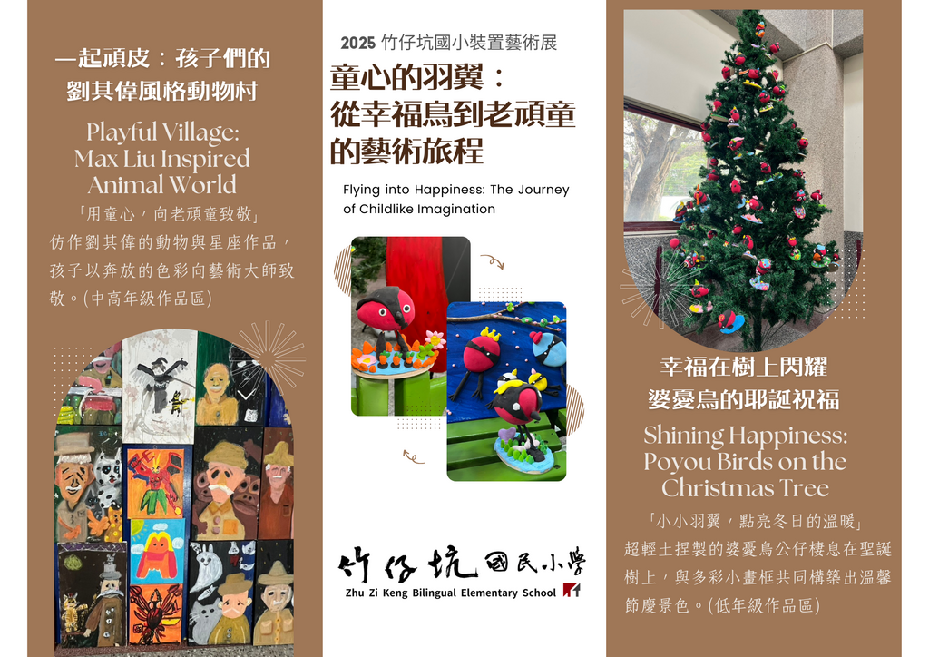 2025-12-30 大里區 竹仔坑國小 教務處 洪曉凌 報導點閱數:216 次校園新聞校園藝術季是竹仔坑國小每年的校慶系列活動,透過藝術讓孩子表達情感、培養美感,也讓校園成為充滿創意的學習場域。今年的校園藝術季延續劉其偉特展的童心精神,以「幸福鳥」為意象,集結全校師生共同創作,展現孩子眼中最純真、最閃耀的藝術想像。 Continuing the Spirit of Art 藝術精神的延續 此次裝置藝術展,將藝術大師劉其偉的創作理念轉化為孩子可親近、可創作、可生活的藝術風景,從畫布走進校園空間,藝術不再只是欣賞,而是成為孩子日常的一部分。 Flying Together into the Future 一起飛吧!幸福鳥的未來旅程 本次藝術季以「幸福鳥」為核心意象,全校229位孩子共同參與創作,每一件作品都是一片羽毛,匯聚成一場關於希望與未來的飛行旅程。在孩子的眼中,世界充滿可能,幸福就像一隻鳥,停留在枝頭,也在色彩與想像中悄然展翅。 Guided by Joy on Campus 童心領航 校園即展場 校園空間化身為大型藝術展場,婆憂鳥成為最可愛的導覽員,引領觀展動線。大型瓦楞板裝置、立體創作與平面作品彼此呼應,讓師生與來賓在行走中看見童心、感受創意,體驗「跟著幸福鳥,展覽更好玩」的藝術旅程。 A Dialogue with Max Liu 向大師致敬的創作對話 中高年級學生以「一起頑皮」為主題,仿作劉其偉筆下的動物與星座世界,運用奔放色彩與誇張造型,向藝術大師致敬。孩子以自己的語言重新詮釋經典,在創作中理解藝術精神,也建立自信與美感。 Shining Happiness 幸福在樹上閃耀 低年級學生以輕黏土製作婆憂鳥,將作品妝點於聖誕樹上,形成溫暖又童趣的節慶裝置。小小羽翼在校園中點亮冬日風景,也象徵孩子心中純真的幸福正在悄悄發光。 Art as Everyday Life 藝術,是孩子的日常 感謝廖秀玲組長、林芳妤老師及陳佑妮老師的用心指導,行政團隊的美感營造,這場校慶藝術季不僅是一場展覽,更是一段學習歷程的呈現,從平面到立體,從仿作到創作,每位孩子都是藝術家,每件作品都在訴說:「幸福可以被看見、被創造,也值得被分享。」在童心引領下,藝術持續在校園中飛翔。(竹仔坑國小)