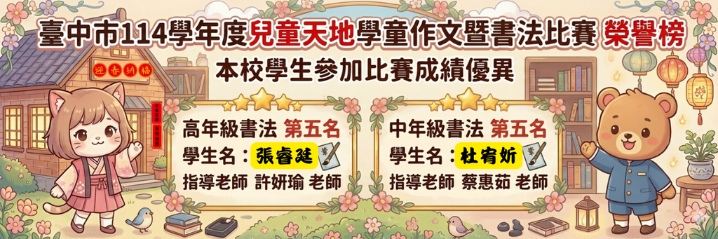 2026-04-11 西區 忠孝國小 教務處 報導點閱數:76 次榮譽事蹟臺中市西區忠孝國小學子在「2026臺中市三好兒童說故事比賽」中表現優異,展現出自信的英語表達能力!在**朱怡苹老師、以及Teacher Grace**的悉心指導下,三位同學於眾多選手中脫穎而出: 三年六班 閻晉濤:榮獲英語中年級組 第三名 四年二班 杜宥炘:榮獲英語中年級組 第三名 五年五班 蔡詠頤:榮獲英語高年級組 優勝 參賽同學透過生動的故事傳遞「三好」精神,不僅為校爭光,更展現了紮實的語言基礎。恭喜以上獲獎同學,全校師生同感欣喜與驕傲!
