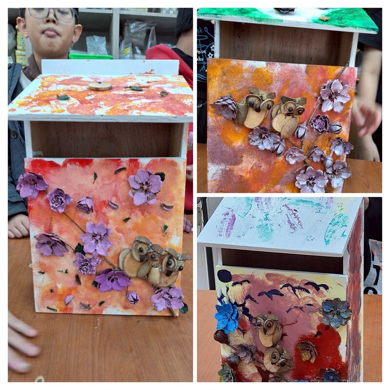 2026-01-16 霧峰區 桐林國小 教務處 報導點閱數:22 次校園新聞繼上一次深受孩子喜愛的龍眼木柴燒 PIZZA 活動後,1 月 14 日下午,本校四、五、六年級課後照顧班的孩子們,再次迎來一堂充滿創意的課程-貓頭鷹信箱 DIY 這次課程持續結合社區力量,與桐林社區發展協會、元大、熊與貓咖啡書房、大屯社區大學共同合作,邀請本校-惠甄志工夥伴及社區發展協會的夥伴們一同教導孩子們動手創作。孩子們先以壓克力漆自由上色,為貓頭鷹信箱注入專屬於自己的色彩與表情;接著再運用大花紫薇、大葉石礫、油杉等天然材料進行拼貼,巧妙組合出貓頭鷹的意象與花朵般的溫柔裝扮。 在熱鬧卻溫馨的創作過程中,孩子們彼此討論、互相幫忙,即使現場忙碌,依然一步步完成作品。當一件件作品完成時,每個貓頭鷹信箱都獨一無二,承載著孩子的想像與心意。 這不只是一堂手作課,更是一段孩子用雙手創造、用心感受、被社區溫柔陪伴的學習時光。看到孩子們捧著作品露出的笑容,所有的努力都化成滿滿的感動~成品真的令人驚艷!