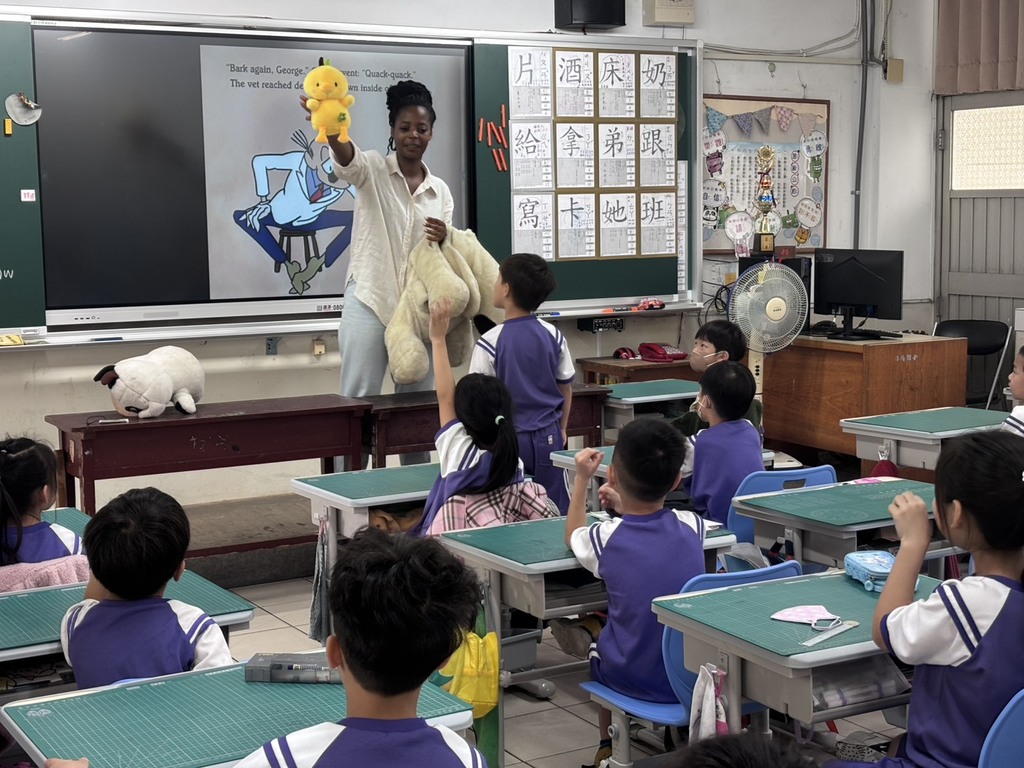 2026-04-17 潭子區 潭陽國小 教務處 報導點閱數:22 次校園新聞為了營造沉浸式的英語學習環境,今日特別邀請外師 Sophie 深入一年五班(105 班)教室,開展一場別開生面的「繪本說故事」活動。Sophie 老師這次帶來了經典繪本《Bark, George》,透過生動的肢體語言與豐富的情境設計,成功收服了全班小學生的心,讓原本生硬的語言課程,變成了一場充滿驚喜的森林冒險。 生動演繹:從「汪汪」到「喵喵」的驚奇之旅 活動一開始,Sophie 老師便展示了可愛的動物布偶。繪本《Bark, George》講述一隻小狗喬治開口卻發出貓叫、豬哼、鴨鳴,就是不會汪汪叫的故事。Sophie 老師化身為故事中的角色,運用充滿戲劇張力的語調,模擬各種動物的鳴叫聲,逗得全班同學哄堂大笑。 在互動環節中,Sophie 老師高舉著黃色小鴨布偶,引導孩子們大聲喊出「Duck!」,現場氣氛熱烈。孩子們目不轉睛地盯著黑板上的單字與大螢幕上的動畫,在歡笑聲中自然而然地學會了 Cat、Duck、Pig、Cow 等動物單字。 動感節奏:全班齊跳「Old MacDonald」 說完故事後,活動進入最高潮。配合繪本中的動物主題,Sophie 老師帶領全體師生跟著大螢幕上的音樂影片,齊力唱跳經典兒歌《Old MacDonald Had a Farm》。孩子們紛紛站起來,跟著節奏擺動身體、模仿動物動作,連原本害羞的孩子也在這股熱情的渲染下,大方地在位子旁手舞足蹈。 共融共學:在快樂中扎根英語力 105 班導師表示,透過外師入班互動,能顯著降低低年級孩子對外語的陌生感與恐懼。Sophie 老師溫暖的笑容與活潑的教學風格,不僅讓孩子們掌握了基本的動物詞彙,更重要的是激發了他們對英語的好奇心。 這場精彩的說故事饗宴,在師生合影的歡笑聲中畫下完美句點。校方未來將持續推動此類互動課程,讓國際教育不再只是課本上的單字,而是孩子們日常生活中最期待的快樂時光。
