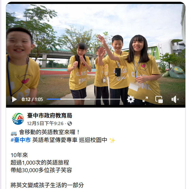 2025-12-12 潭子區 潭陽國小 教務處 報導點閱數:31 次校園新聞本校將於下學期申請教育局「行動英語車」進校服務,特別向家長與社區朋友分享這項深受學生喜愛的英語學習資源。行動英語車以專業外師、多媒體設備與情境化課程打造沉浸式英語環境,讓學生在遊戲、互動與活動中,自然而然提升英語聽說能力。 過去參與過的學生反應熱烈,不僅更願意開口表達,也培養了跨文化理解與國際視野。本校期望透過申請行動英語車,為孩子帶來更多元、更有趣的英語體驗,打造更友善的雙語學習環境。敬請家長持續關注,與我們一起期待下學期精彩的英語學習旅程! https://www.facebook.com/share/v/1ABhC2mAqa/?mibextid=wwXIfr