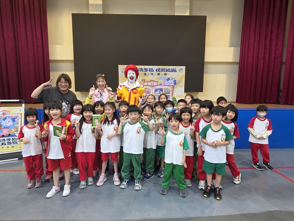 2026-03-27 太平區 新平國小 學務處 報導點閱數:166 次校園新聞隨著腸病毒進入流行季節,其超強傳染力成為校園與家庭的防疫重點。為了讓孩子們在輕鬆無壓力的環境下建立正確衛生習慣,新平國小特別邀請超人氣防疫大使「麥當勞叔叔」蒞臨校園,為幼兒園及國小低年級學童帶來一場別開生面的「洗趣腸病毒,健康樂無憂」防疫宣導活動。現場歡笑聲不斷,孩子們在音樂與互動劇中,輕鬆將正確洗手觀念深植腦海。 ※ 寓教於樂!洗手舞與互動劇嗨翻校園 當經典卡通人物麥當勞叔叔踩著大紅鞋、帶著招牌笑容現身禮堂時,全場學童瞬間爆出熱烈歡呼。活動捨棄了傳統單向宣導的枯燥教條,改以生動活潑的「洗手互動劇」拉開序幕。 麥當勞叔叔帶領全體師生大跳熱情的「洗手舞」,將繁瑣的洗手五步驟「濕、搓、沖、捧、擦」編進歌詞與舞步中。看著台上台下整齊劃一地搓著小手,防疫宣導瞬間變成了一場歡樂的嘉年華。隨後的有獎問答更是將氣氛推向最高潮,孩子們紛紛高舉雙手搶答,準確點出正確洗手七字訣 「內外夾弓大立腕」。學生洪孟漢擔任麥當勞叔叔的小助手很開心:「今天能看到麥當勞叔叔真的超開心!我最喜歡跟他一起跳洗手舞,希望大家都不要得腸病毒!」 ※親師生齊讚:讓防疫變成好玩的事 面對這場成功的防疫盛會,家長會湯展智會長與現場學童皆給予了高度回饋說:「身為家長,每到腸病毒季節總是提心吊膽,深怕一人感染、全家淪陷。今天看到孩子們目不轉睛地看戲、跟著大跳洗手舞,真的很感動!這種『寓教於樂』的方式比大人講一百遍都有效。」愛心媽媽扮演洗手小隊,感謝學校的用心規劃,讓防疫宣導不再硬梆梆,而是充滿歡笑。李秀櫻校長表示:「新平國小一向重視學童的安全健康,這次非常感謝麥當勞叔叔之家慈善基金會的支持。透過孩子們最愛的偶像親自示範,不僅大幅提升了學習動機,更讓正確洗手內化成生活習慣。我們希望藉由這樣的活動,由學校推廣至家庭,攜手守護孩子的健康。」 活動最後在溫馨的全體大合照中圓滿落幕。新平國小透過本次活動,成功將生硬的衛教資訊轉化為學童觸手可及的歡樂記憶。唯有親師生共同落實「勤洗手」的良好習慣,才能真正有效降低交叉感染風險,讓孩子們在安全、健康的環境中快樂成長!