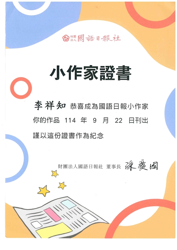 恭喜!六年三班李祥知同學,獲「國語日報小作家證書」!