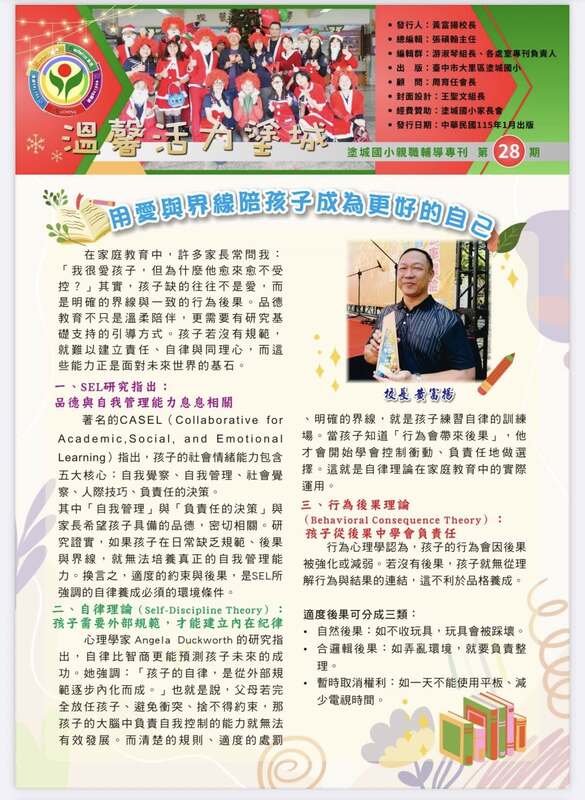 2026-02-04 大里區 塗城國小 輔導室 報導點閱數:84 次校園新聞【塗城報導】塗城國小第28期「溫馨活力塗城親職專刊」正式上線!為順應數位閱讀趨勢,本期起全面改版為電子刊物,家長只需透過學校首頁「快速連結」或專屬網址,即可輕鬆點閱,隨時掌握校園脈動。 本期內容精彩豐富,除了涵蓋教務、學務、總務及輔導室的重點活動報導外,更收錄了愛心志工隊的付出身影及「親職教育專欄」。其中「榮譽榜」更是亮點,詳實記錄了塗城學子在文武各方面的優異表現。校方期盼透過雲端共讀,讓家長與孩子共享榮耀,增進親子互動。 感謝塗城國小家長會長期挹注經費,全方位支持專刊發行。這份來自家長會的支持,讓親師溝通橋樑更加穩固,歡迎各位家長踴躍上線閱讀,感受塗城的溫馨與活力。