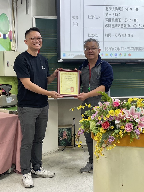 2025-12-24 潭子區 潭陽國小 教務處 報導點閱數:136 次校園新聞本校再創佳績!榮獲「114年度教育部教學卓越獎—佳作」,以課程主題「摘星DREAMER.串起PEARL走入世界」深獲評審肯定。這份榮耀,是全體師生多年來深耕教學、攜手前行的最佳見證。 今天的教師會議,校長親自頒發教育部獎狀,向獲獎團隊致上最誠摯的祝賀與感謝。校長表示,教學卓越不是口號,而是每天在教室裡為孩子點亮希望的行動;感謝教師團隊以專業與熱情,陪伴孩子勇敢追夢、連結世界。現場掌聲不斷,感動滿溢。 「摘星DREAMER」象徵孩子勇於仰望星空、設定目標;「PEARL」則串起跨域學習、品格素養與國際視野,讓學習從校園出發,走向更寬廣的世界。課程以學生為本,融合探究實作、在地關懷與全球連結,讓每一顆珍珠都能發光。 這份獎項屬於每一位投入教師、支持的家長與努力的孩子。未來,本校將持續以愛與專業前行,讓教育成為改變生命的力量,讓孩子帶著夢想,勇敢走向世界。