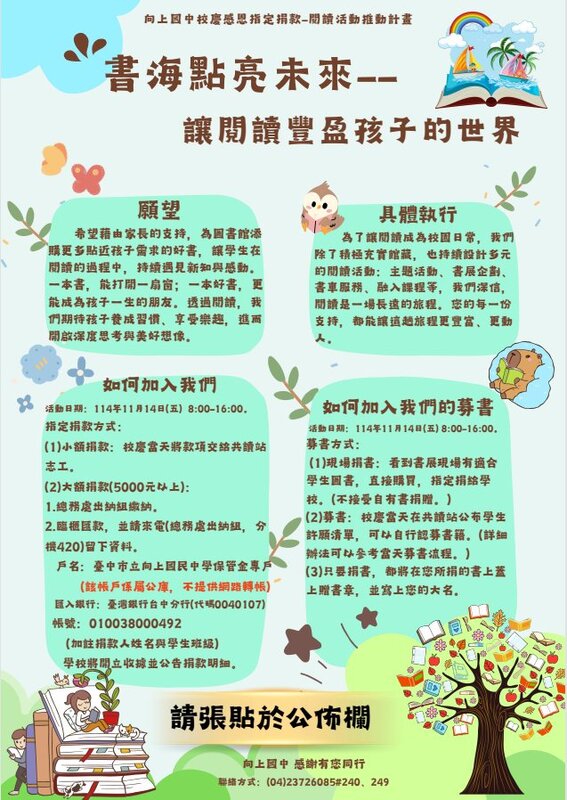 2025-11-13 西區 向上國中 教務處閱推教師盧姿吟與洪淑華組長及陳佩庭主任ˊ 報導點閱數:82 次校園新聞書海點亮未來——讓閱讀豐盈孩子的世界 為推廣閱讀風氣、營造書香校園,本校將於校慶當日舉辦一系列閱讀推動活動,讓閱讀成為學生生活的一部分,啟發思考、豐盈心靈。 誠摯邀請各位家長於11月14日校慶當日蒞臨參與,與我們一同分享閱讀的喜悅,陪伴孩子在書香中成長,讓知識的光,持續點亮未來。